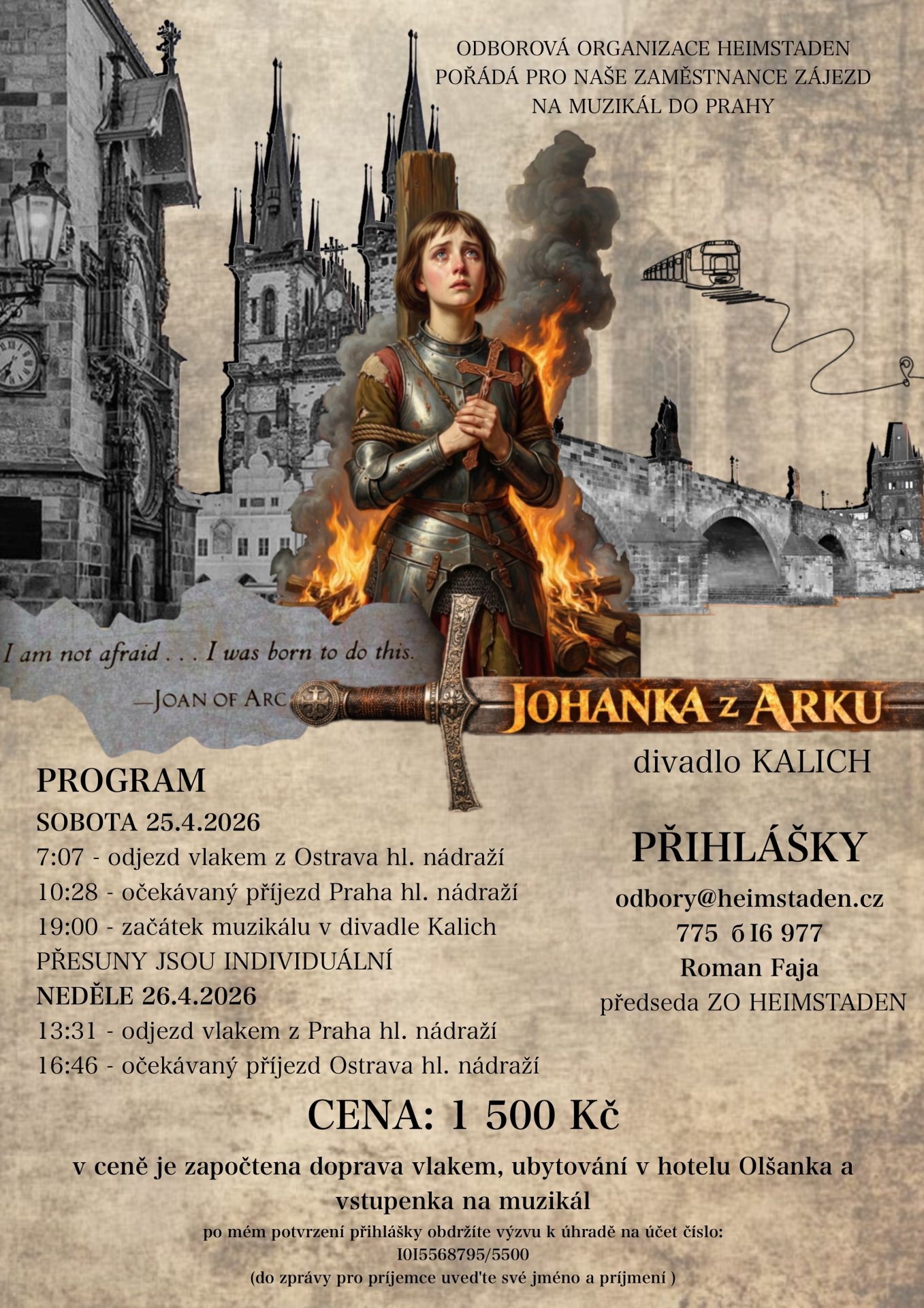ZO Heimstaden pořádá pro zaměstnance zájezd na muzikál Johanka z Arku. Bylo zakoupeno 50 vstupenek a ubytování je zajištěno v hotelu Olšanka. Doprava proběhne vlakem.
